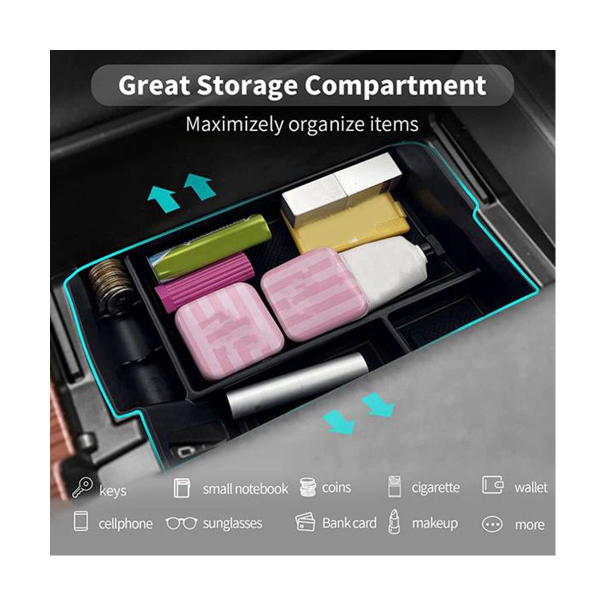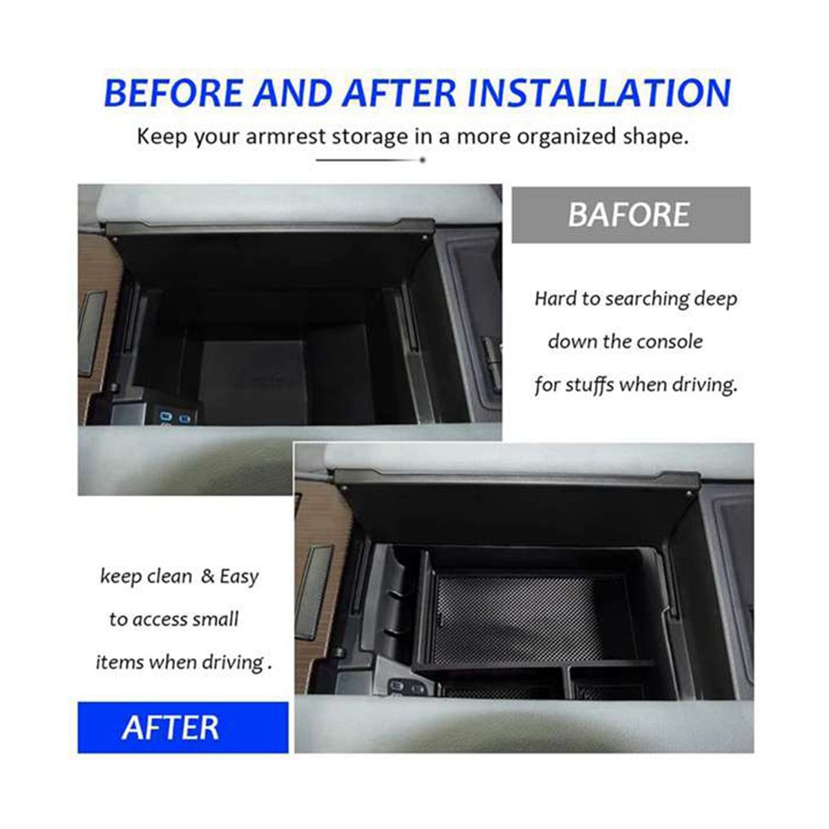 [INSTALLATION]-Very easy to install, just drops the armrest storage box in the correct place, no other tools required. Keep your armrest storage in a more organized shape.