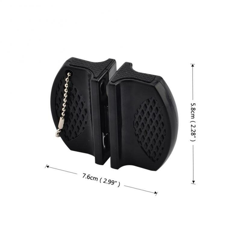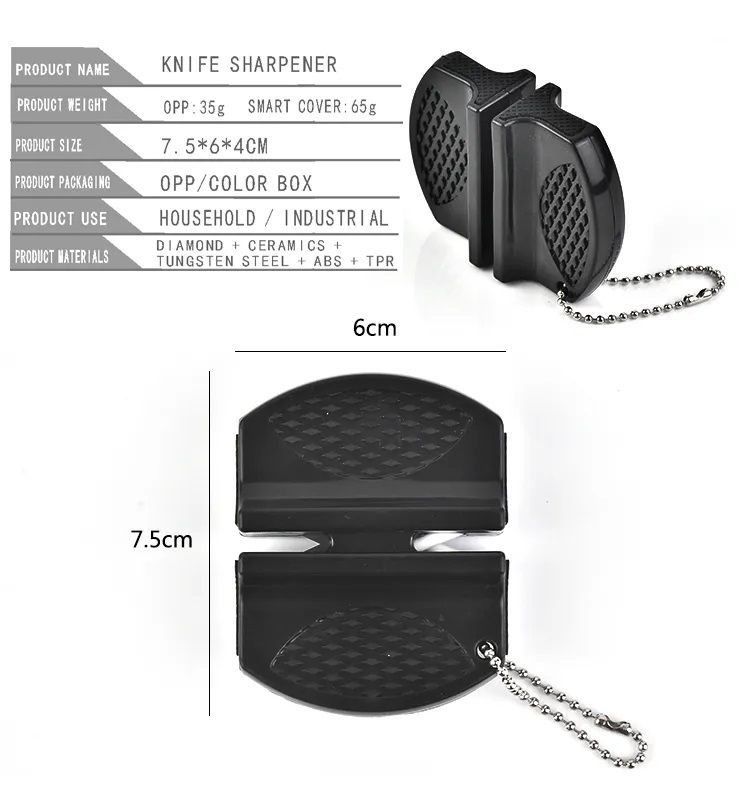 Specifications:Name: Portable Mini kitchen Knife SharpenerItem Type: Knife sharpenerMain Material: ABS + sharpener grinderWeight: 0.058kgCertification: FDAFeature: Eco-FriendlyType: SharpenersMetal Type: STAINLESS STEELMaterial: Tungsten + Ceramic + ABSColor: BlackSize: 7.5x5.6x2.5cmFeature 1: Mini Knife SharpenerFeature 2: Butterfly Type Knife SharpenerFeature 3: Two-stage Knife SharpenerFeature 4: Kitchen Tools