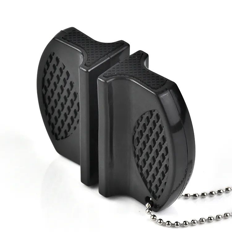 Kitchen Knife Sharpening Stone Professional Sharpener1. Anti Slip Handle: The non slip handle is wide, comfortable to hold, even force, and there is no loose hand. The double flute design is suitable for knives that require full maintenance.2. Anti Slip Pad: The base is inlaid with non slip soft rubber pads, which will not move when sharpening the knife, and the operation is labor saving.3. Incisive Knife Sharpener: The crossed carbide blades sharpen quickly and the finely ground crossed ceramic bars provide knife sharpness.4. With a Hook Chain: The knife sharpener is equipped with a hook chain, which can be hung after use, saving space, easy to carry, and easy to store.5. Wide Range of Applications: Portable mini knife sharpener can grind all kinds of fruit knives, kitchen knives, meat cleavers, outdoor knives, scissors, etc.
