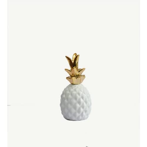 The pineapple has been the universal symbol of warm welcome for centuries. Bring a contemporary touch of hospitality to your home with this ceramic display. Featuring a shiny gold row of leaves on an elegant glossy white finish, this sculpture is sure to announce to your guests. This pineapple matches a variety of styles and decors and adds a touch of cheeky sparkle to your chic office, eclectic living room or tropical sunroom.
