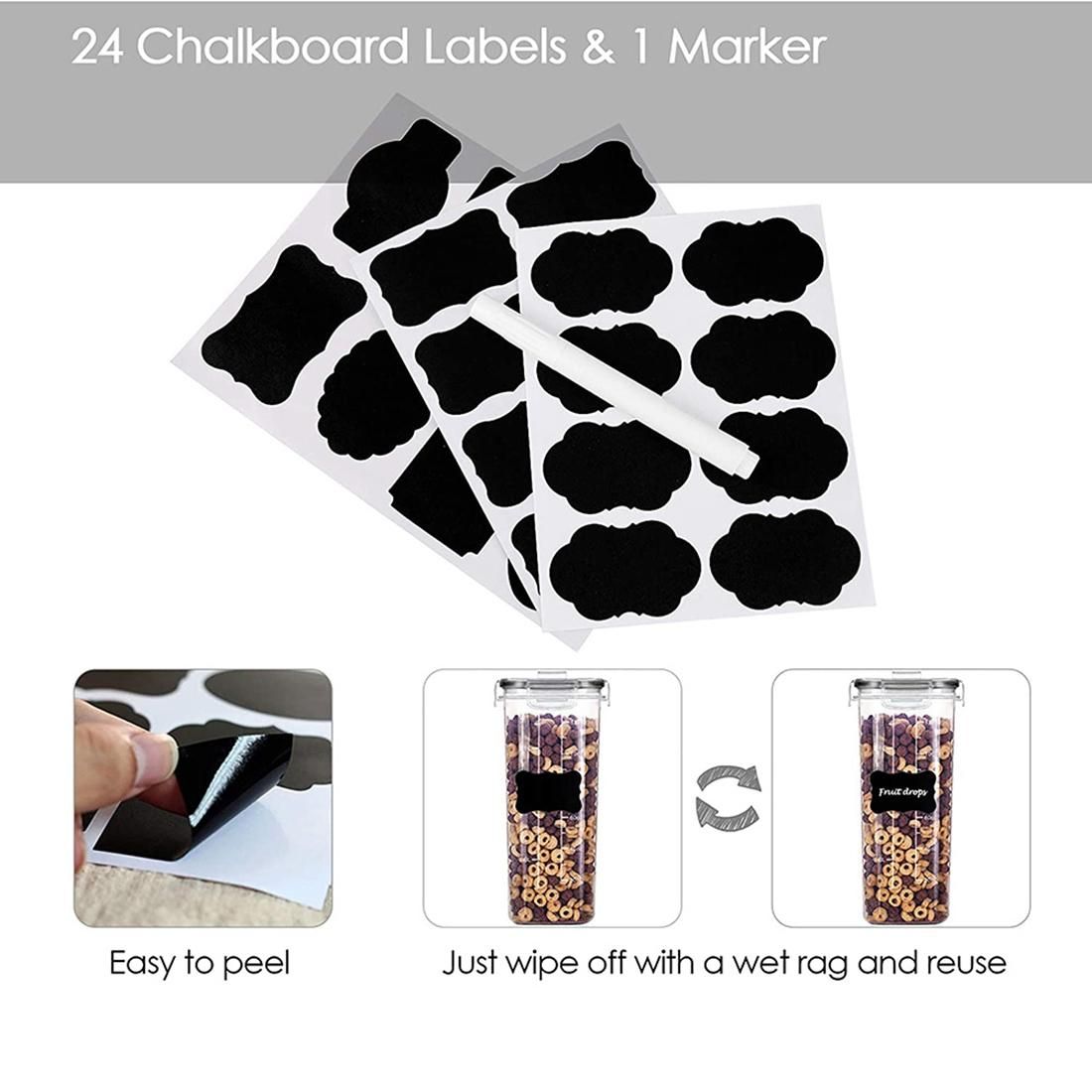 Come With Convenient Labels----Except 4 food storage containers, you will also receive 24 pieces labels, which will help you never confuse flour with powdered sugar or baking powder with baking soda. They are reusable, you can switch contents whenever you need. Just wipe clean with a damp cloth to change what you have written, peel and Re-stick.