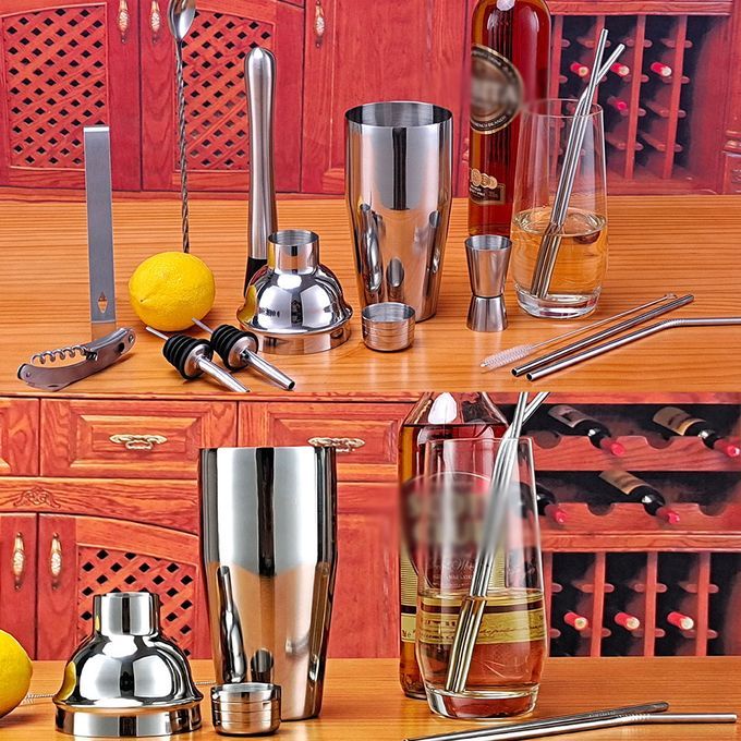 13pcs Set(350ml, 550ml, 750ml, boston shaker optional): contains 1 * cocktail shaker, 1 * cocktail muddler, 1 * cocktail spoon, 1 * Jigger(15/30ML), 1 * opener, 1 * ice tongs, 1 * straw brush, 2 * bend straw, 2 * straight straw, 2 * cocktail pourer.