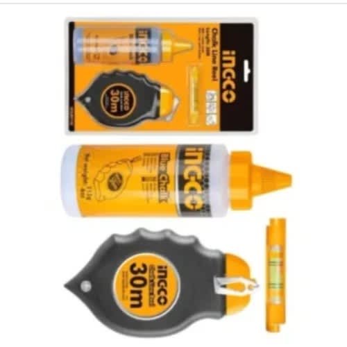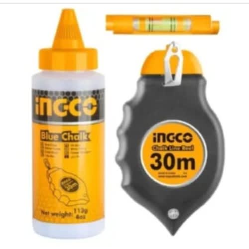 Ingco industrial Chalk line with retractable reel and hook, designed for garden or ground marking. Ideal for making boundaries and straight lines, the chalk line reel set has a 30m length line and comes with a 113g powder bottle.
