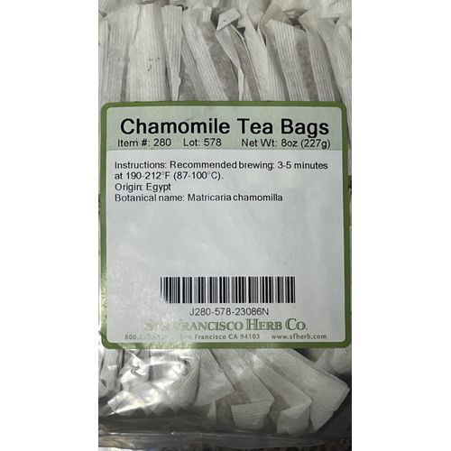 Tea bags filled with German chamomile flowers grown in Egypt. This product is packaged in oxygen-bleached tea bags which have no string, staples, or tags.