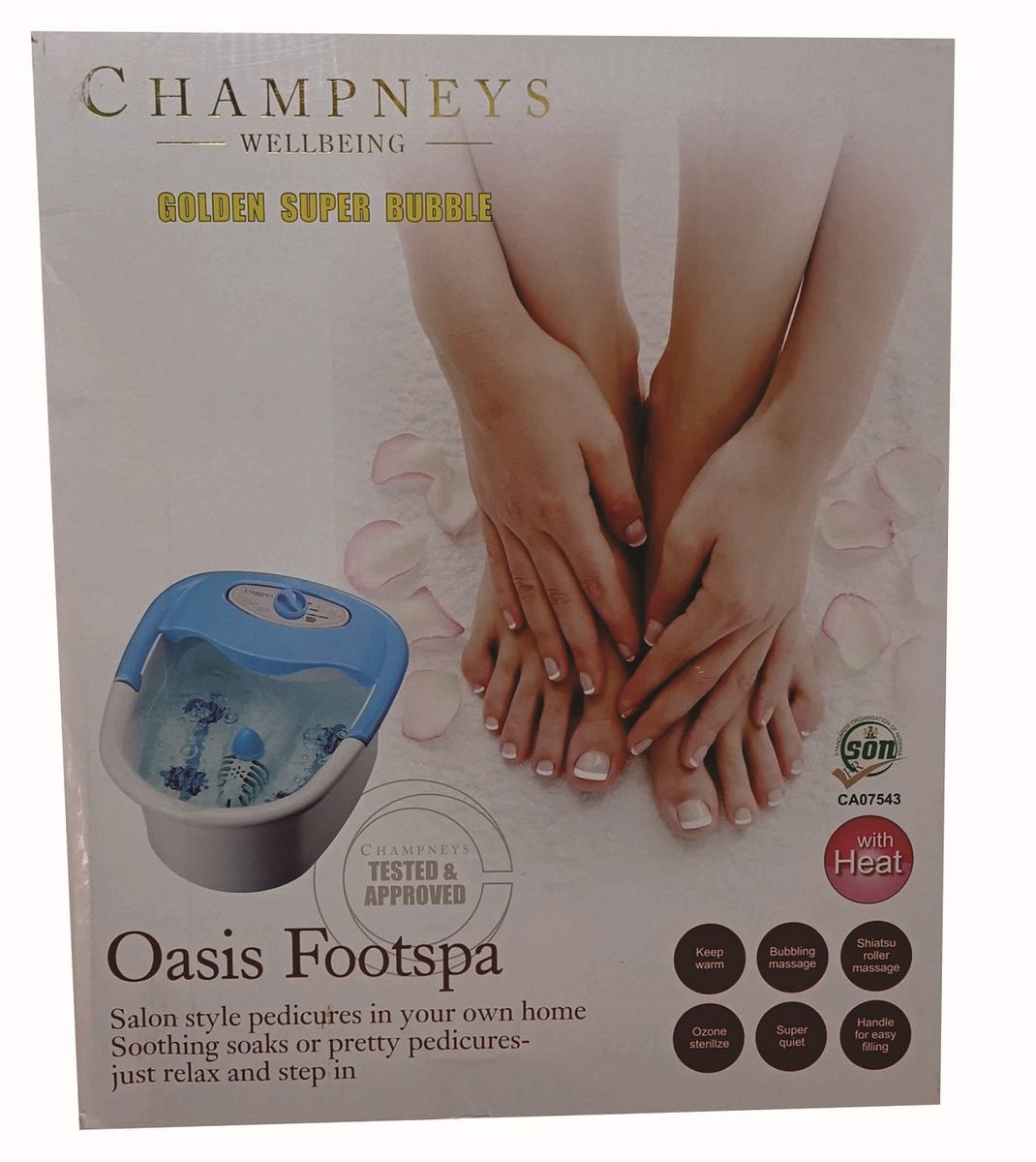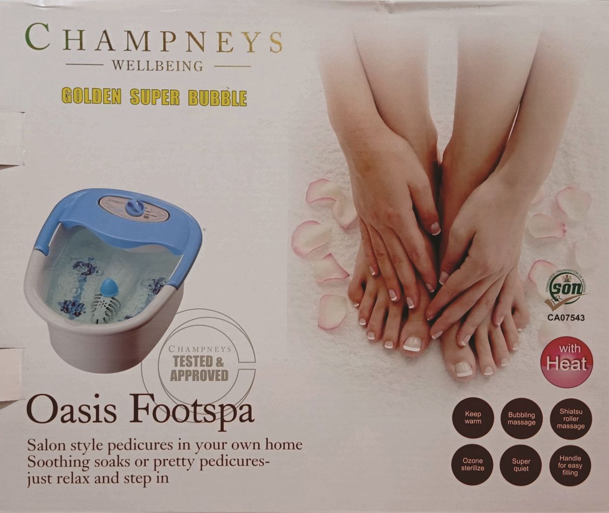 Champneys salon style pedicure in your homesoothing soaksjust relax and step inChampneys Infrared Heat Foot Spa; Compact, lightweight foot spa. Three settings for a varied operation; Infrared heat provides soothing comfort to revive tired feet; pressure rollers provide a soothing massage; Multiple settings for both heat and massage. Benefits : Compact, lightweight foot spa Three settings for a varied operation Infrared heat provides soothing comfort to revive tired feet pressure rollers provide a soothing massage Multiple settings for both heat and massage