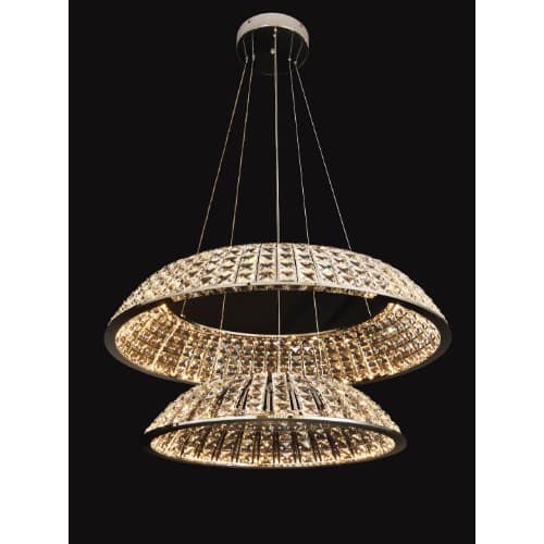 This elegant crystal chandelier features a modern double-ring design, with sparkling crystals embedded in polished metal frames. It provides a luxurious ambient glow, perfect for enhancing living rooms, dining areas, or grand entryways. Suspended by adjustable cables, it blends contemporary style with timeless sophistication. 18 watts
