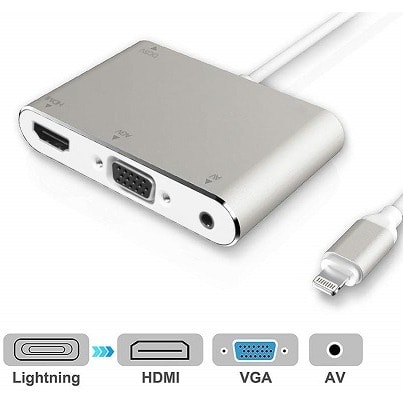 MULTI-FUNCTIONAL:4 in 1 Lightning to HDMI/VGA/AV/3.5mm Audio Port Adapter. Compatible with devices (such as TV, projector, monitor) which is come with HDMI/VGA/AV/3.5mm Audio Port, Support both audio and video output or HDMI & VGA display simultaneously.
