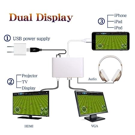 Full 1080P HD Display; The Lightning Digital HDMI VGA VA Adapter supports mirroring of what is displayed on your device screen, including movies, games, images and more to your HDMI-equipped TV, display, projector or other compatible display in up to 1080p HD, present you the larger and clearer screen experience..Easy to Install & Plug and Play; No need any APP & Personal Hot spot or WIFI , No need to adjust the Mirror of iPhone/iPad ( Please Note: 5V 1A USB Charging cable MUST be plugged before use ), just insert each interface to corresponding device, click the "Trust" button when connecting and then wait a few seconds to connect automatically..Easy To Carry;--- With light and small design, it is very convenient to carry and connect your iPhone, iPad anytime to a HDMI-equipped devices for home entertainment, business meetings, education, training and etc..Cost-Effective & Wide Compatibility; Great but cheaper way than buying a smart TV for viewing your iPhone/iPad through the TV with this affordable and high-quality adapter. Fully compatible with Apple iPhone X, iPhone 8/ 8 Plus, iPhone 7/7 Plus, iPhone 6/6S, iPhone 6 Plus/ 6S Plus, iPhone 5/5S/5C/SE; iPad Air, iPad Pro, iPad mini series ; iPad Pro, iPod Touch 5th/ iPod Touch 6th and other the lightning 8 pin devices..Worry-free Purchase; With light and small design, the Adapter is very convenient to carry and connect your iPhone/iPad at anytime to a projector