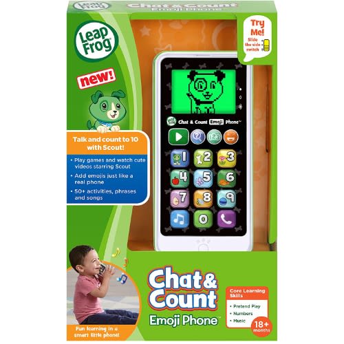 Say hello to Scout on the Chat & Count Emoji Phone! Similar to a smart phone, but built just for toddlers, this toy phone lets children call Scout, have playful conversations and receive pretend phone calls and voicemail messages. Explore numbers 0-10 with animations featuring a bunch of objects to count. Kids can even watch cute videos featuring Scout, and add emojis just like on social media sites. Dial up the exciting pretend play.