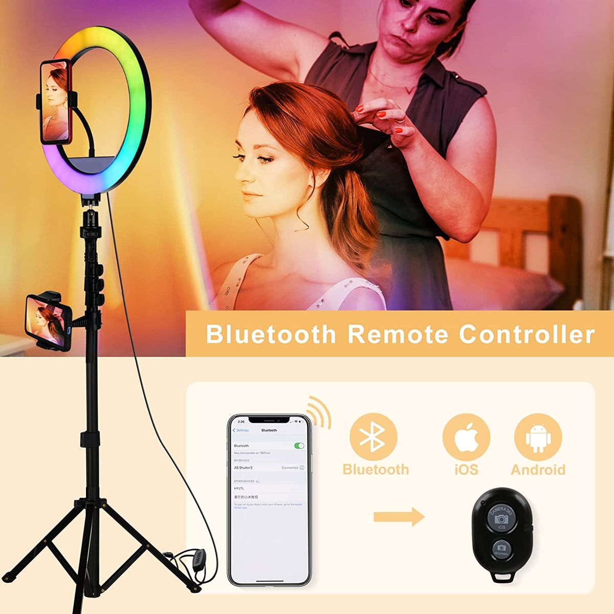 Well here it is, your solution a stylish LED ring light equipped with a phone holder, 210 cm tall, Bluetooth remote, USB cable. This dimmable led ring light has 3 color mode (white, cool white, warm white) from 1% - 100% Perfectly dimmable brightness and colors meet all your needs. Easily switch color temp to observe all kinds of makeups, avoiding awkward makeup disasters. This colorful LED ring lighting specializes in giving your face a professional look, getting a dramatic improvement, and more confidence in Selfies, Make-up, Live streaming, Beauty bloggers, Video calls, Interviews, and online meetings.