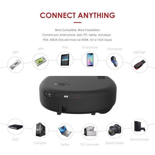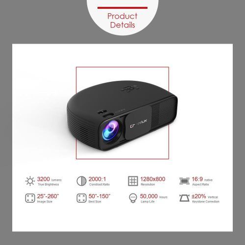 ● 1280 x 800 resolution, 1080p ● Lifespan up to 50000 hours ● Lower noise compare with our other projectors, less than 42dB ● 3200 lumens which will meet your needs. Best for home theater, games, small office room, small clroom ●Excellent Picture Quality With optical gl lens technology, 3200 lumens high brightness mini projector but huge projection size 25 - 260 inches ( best for 50 - 150 inch ). 1280 x 800P native pixels resolution screen and up to 1080P. 2000:1 contrast ratio for superior picture color. You will get ultimate visual experience just like in a cinema. ●La d Technology Adopted diffuse reflection to protect your children's eyes. And built-in Amplifier chip and SRS sound & HiFi level eo speaker, which can make you enjoy best watching experience. You can watch movies via DVD, Blue-Ray DVD player and U-disk. ( Note: do not Dolby sound. ) ●Strong Connection Our home theater projector enables to connect to Roku g Sti / Chromecast / Laptop / blue-ray DVD player / PS3 / PS4 / Xbox / TV box via HDMI port; connect to PC to play game via VGA port; hook up to headphone / outer speakers via audio port; 2 x USB slots: plug U-disk / hard disk device. ●Updated Fan Sound and System Equipped with an advanced cooling system with heat dispersion, the fan noise is only 48db, which is more suitable for watching movies or playing games when your baby is sleeping. Environmental friendly and energy saving, which can last 50000 hours long lamp life. ●Compact , Portable Adapters are required if you connect the projector to a iPad, iPhone or other tablets and smart phones. Ideal for Christmas and Thanksgiving Party, home theater entertainment, family movie time, football / sports events, TV series and video games.