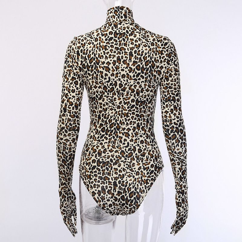 1X Cheetah Leopard Bodysuit for Women Bodycon Body Suit Turtleneck gloves+Long Sleeve Playsuit Printed Romper Jumpsuits