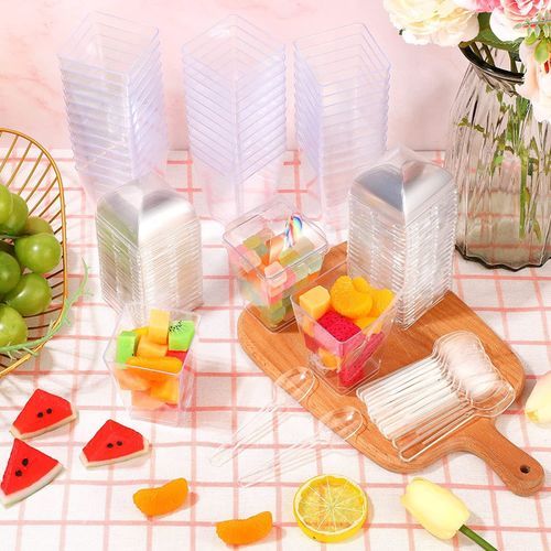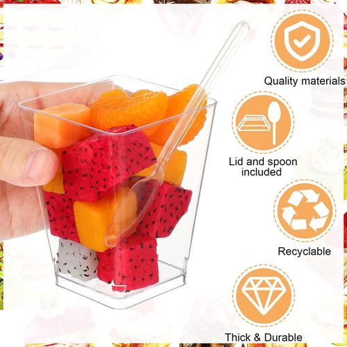 These square dessert cups come complete with 200 pieces of dessert spoons and resealable plastic lids, which can help keep food tasting fresh and also guard against dust. These appetizer cups work well at holding individual servings of party desserts.