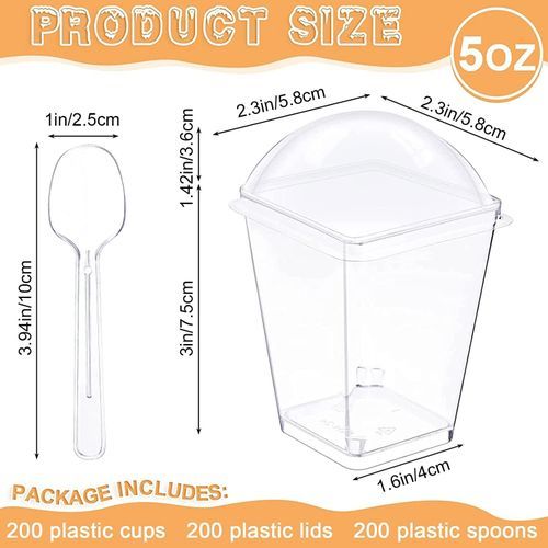 - Value Pack: this set includes 200 pieces of 5 oz plastic home bakery mousse cups with 200 individually packed clear mini spoons and 200 cup lids, which is a nice match for picnics, family gatherings and afternoon desserts, sufficient quality can meet your dessert needs and then enjoy your leisure time