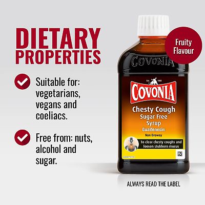 Covonia Chesty Cough Sugar-Free Syrup is a cough remedy to help loosen stubborn mucus or phlegm and provide relief from chesty coughs.Covonia Chesty Cough Sugar-Free Syrup contains guaifenesin to help loosen stubborn mucus and clear chesty coughs.