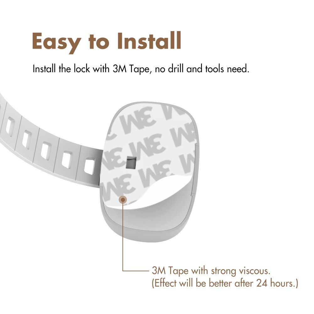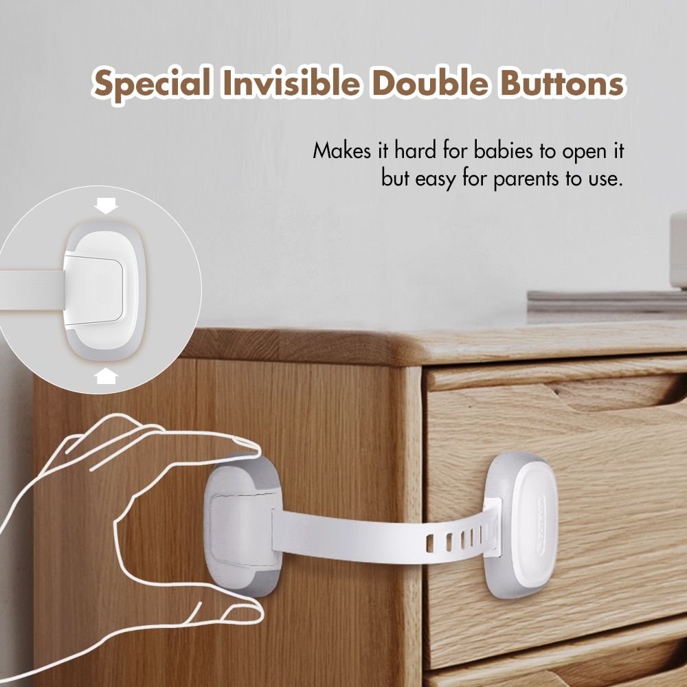 1. High quality material with soft belt can give priority to extending product life.2. Invisible buttons make it hard for babies to open it, but easy for adults to use.3. Adjustable belt can match more home conditions, like cabinets, cupboard, drawers, fridge door, toliet and so on.4. With strong 3M sticker can be easy to use and no harm to your furniture. 3M sticker can be removed by hot hair dryer.