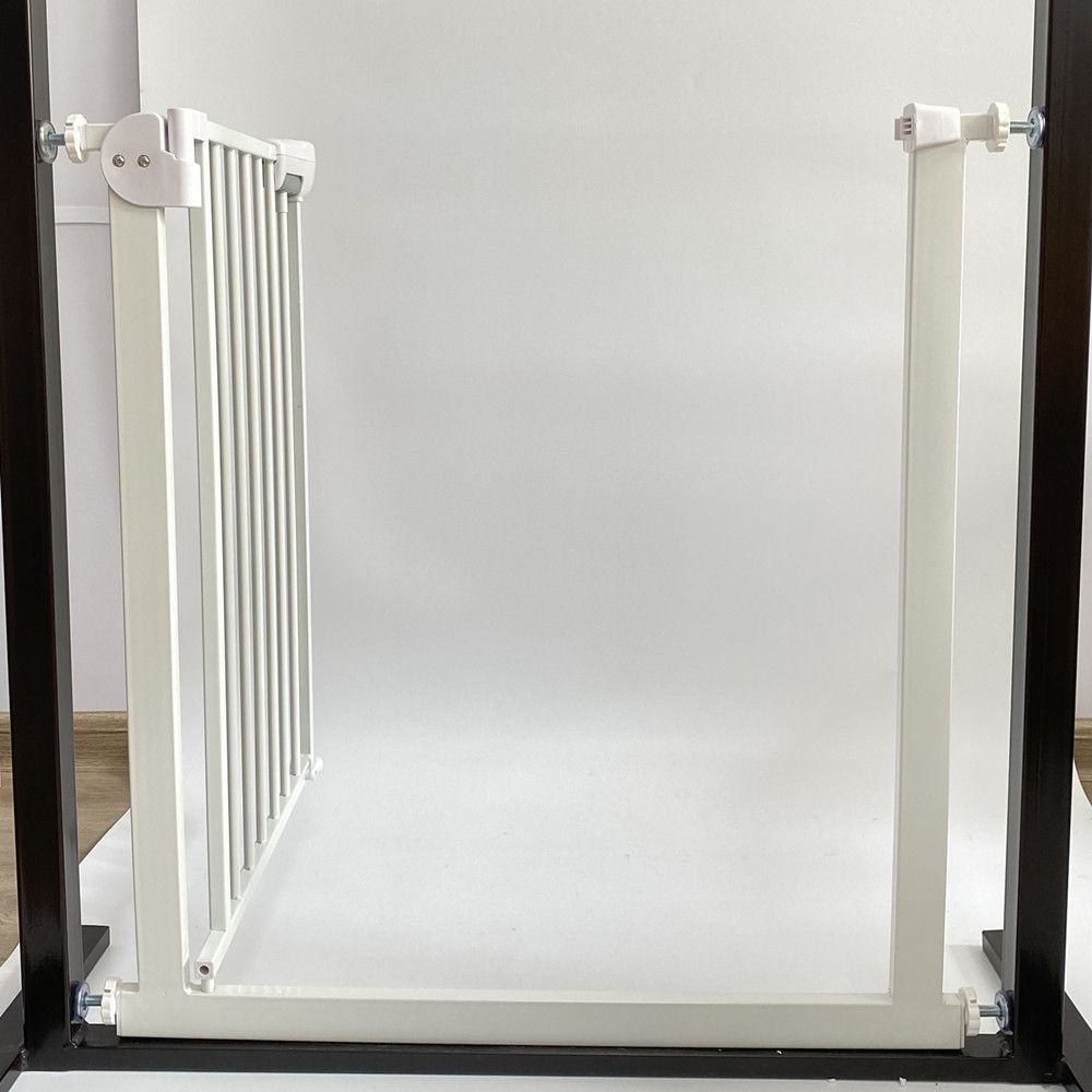 Safety gate that adjusts to fit openings from 73 cm to 80 cm and can be extended up to 94 cm with separate extensions (7 cm, 14cm, 20cm, 30cm, 45cm, 56cm)