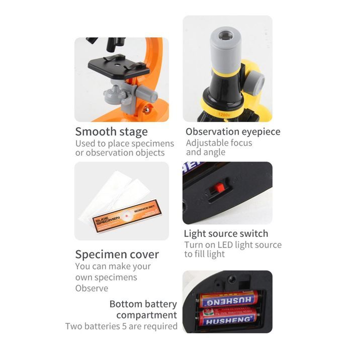 This microscope provides high for educational applications, 100x, 400x, and 1200x and 90 rotation observation angle to meet the needs of kids.