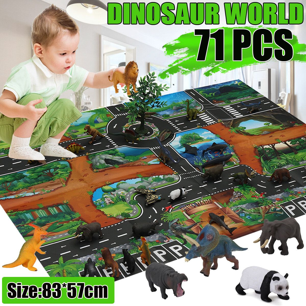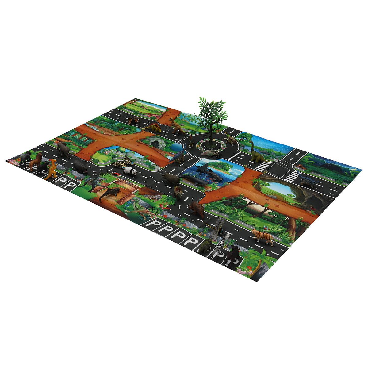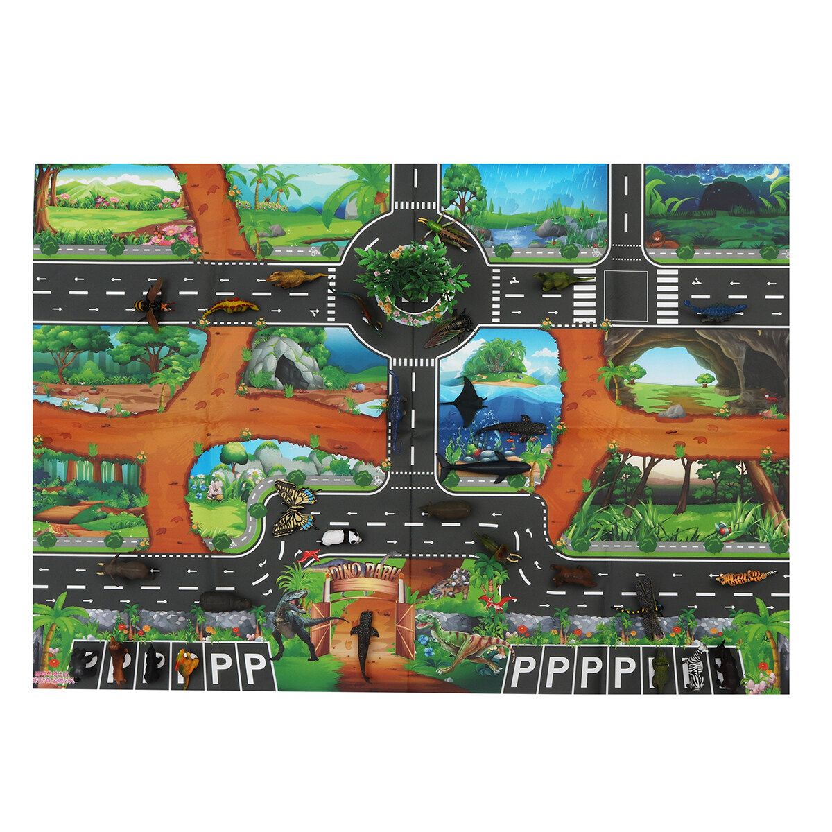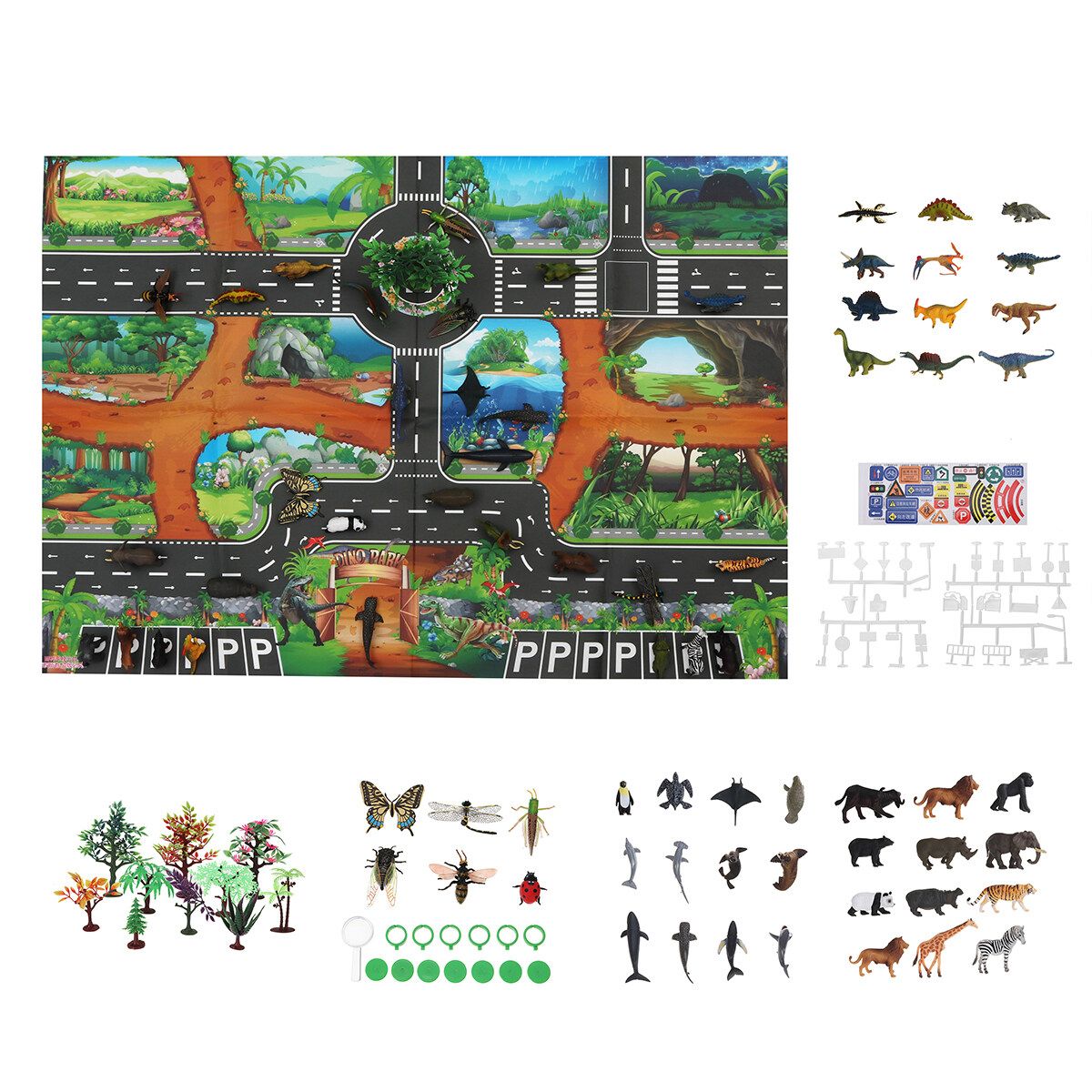 (Can choose to buy according to your needs.) 1 x Map 10 x Trees 6 x insects 12 x Marine Animals 12 x Wild Animals 12 x Dinosaurs 28 x Traffic Road Sign A 28 x Traffic Road Sign B 1 set Dinosaur World(109 pcs)