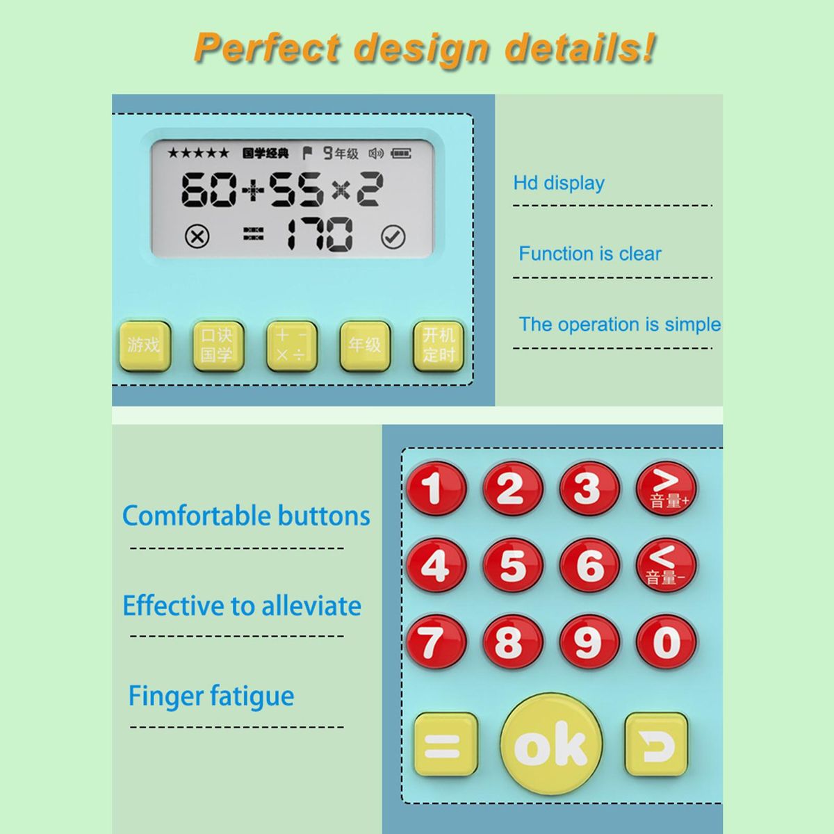 By using this oral calculator, children can exercise their mathematical skills of addition, subtraction, multiplication and division, which helps them to develop their intelligence and improve their hands-on skills.