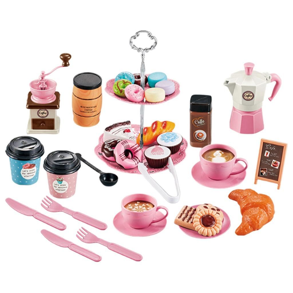 The set includes cake tray, pot, grinder, coffee bucket, coffee pot, menu stand, bread, cake, cupcake, biscuit, , donut, coffee cup, spoon, food tongs, and fork, etc.