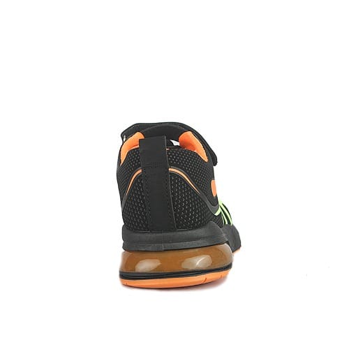 Boys black and red sneakers with rubber sole. Hook and loop closure for easy on and off and lock down fot