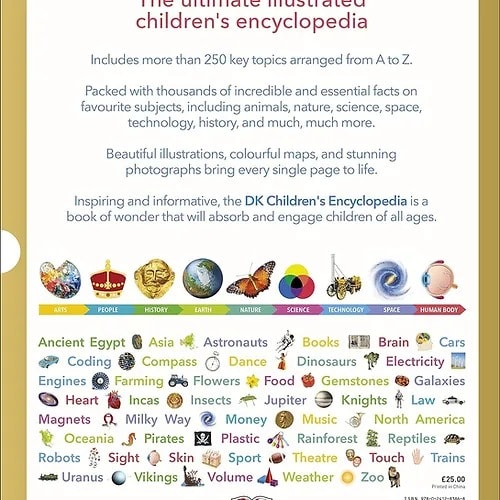 The ultimate illustrated children's encyclopedia full of information and amazing images on over 250 key topics arranged from A to Z. This is the book that explains everything for kids aged 7 to 9. Packed with thousands of incredible and essential facts on favourite - and KS2 - subjects, DK Children's Encyclopedia covers nine different colour coded subject art, people, history, earth, nature, science, technology, space and human body. Arranged alphabetically, every page in this children's encyclopedia is packed with fun facts and amazing photographs. Your child can dive straight in working from the front to the back or jump to a page that catches their eye to discover all about our wonderful world. If they are not sure where to go next, the 'See also' boxes will suggest related topics. This lets children make links across topics and subject areas and create their own journey through DK Children's Encyclopedia . There are also comprehensive content and index pages and a glossary which lists of some of the more difficult words with an explanation. While the reference section contains useful lists, diagrams and tables, including a map of the world and lists of great artists, scientists and writers. Finally there are 'The Story of...' pages which bring together information about different subjects to get children thinking about things from lots of different angles. Inspiring and informative, the DK Children's Encyclopedia is a classic encyclopedia and a book of wonder that will absorb and engage children for many hours. Here's a selection of the topics in DK Children's Encyclopedia : Ancient Egypt, Asia, Astronauts, Books, Brain, Cars, Coding, Compass, Dance, Dinosaurs, Electricity, Engines, Farming, Flowers, Food, Gemstones, Galaxies, Heart, Incas, Insects, Jupiter, Knights, Law, Magnets, Milky Way, Money, Music, North America, Oceania, Pirates, Plastic, Rainforests, Reptiles, Robots, Sight, Skin, Sport, Theatre, Touch, Trains, Uranus, Vikings, Volume, Weather, Zoo