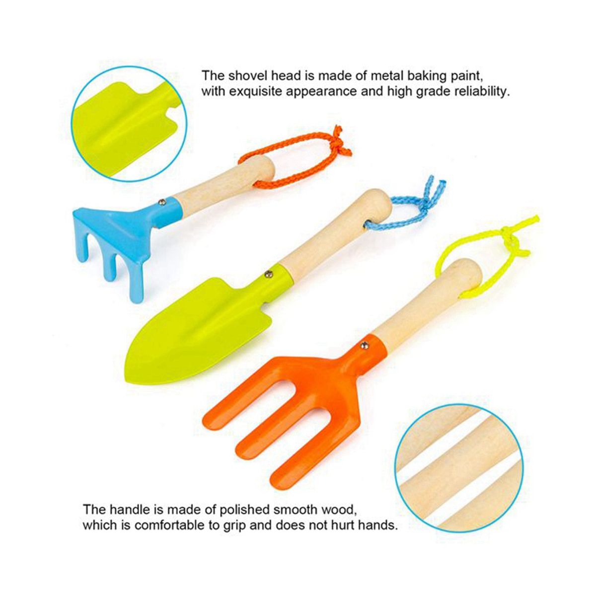 Safe Material: The kids Garden tools have sturdy metal heads and wooden handle, Easy to clean and long-lasting use. Rounded edges design, safe .