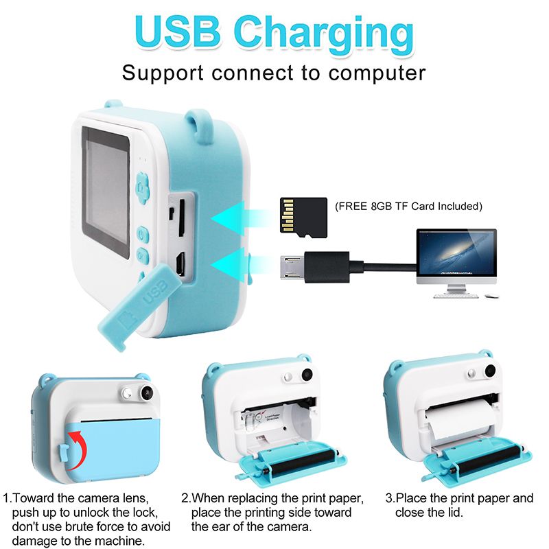 The kid camera has functions of taking pictures, recording 1080p videos, and printing photos instantly. 3 in 1 designed camera is more convenient for children to record their wonderful moments.