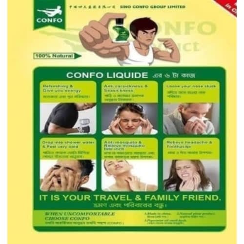 This prouct is of liquid ,extracted by advanced technology from natural plants, such as camphor wood, mint etc. with its specific smell cool and spicy, the product has great effect on dispelling mosquitoes,.relieving itches, cooling, relieving hurts, deep muscle relaxation, relieving body/muscle pains. It can be used for relieving cold, nasal congestion and headache, motion sickness in vehicles and ships, bruises and sprains, muscle soreness, abdominal pain and tooth ache.It has a special packaging design, which is convenient for pick up and transport.Classic quality, excellent heritage: CONFO inherited the traditional Chinese culture of herbs and adheres to the idea "natural and balanced". Natural ingredients, health and safety: natural plant extracts with unique technology. Natural ingredients and has a significant effect. It can refresh the brain and the mind.Magic formula, multiple effects: special formula. It has multiple effects: reduction of inflammation, analgesia, relief of itching. It enjoys great popularity among customers due to its high quality features. It is a necessary product in everyday life.Check flier for usage and further details.