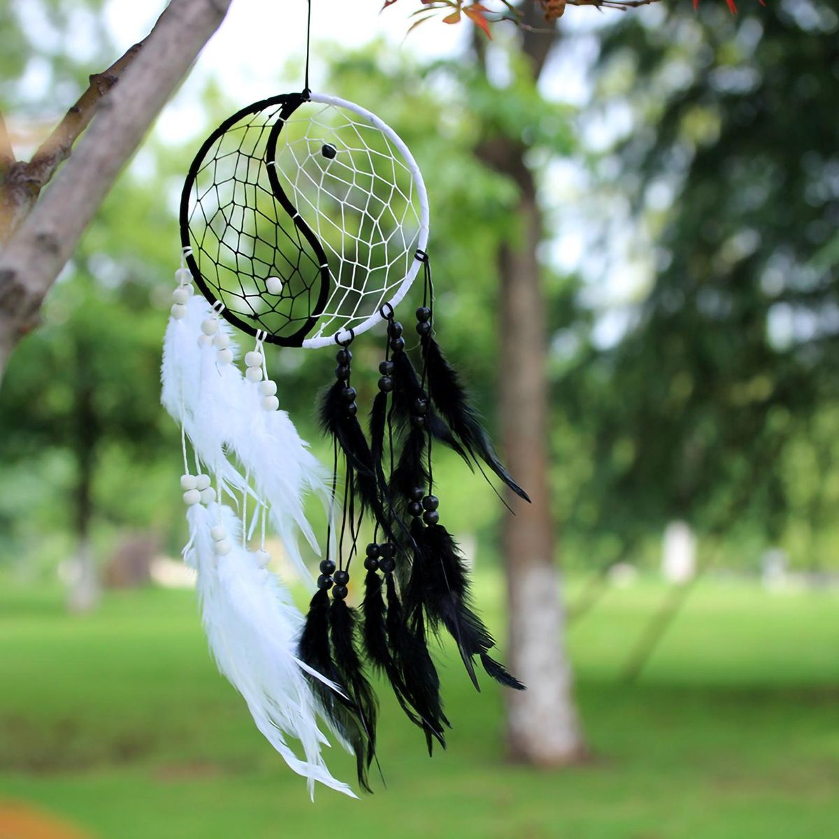 Our exquisite dream catcher with a unique chinese tai chi design, perfect for creating a peaceful and harmonious atmosphere in any space. this beautifully crafted dream catcher features soft feathers that delicately float in the air, providing a sense of comfort and relaxation. hang it in front of your bed to allow good dreams to pass through the hole and rest on the feathers, while nightmares are caught in the net and disappear with the rising sun.
