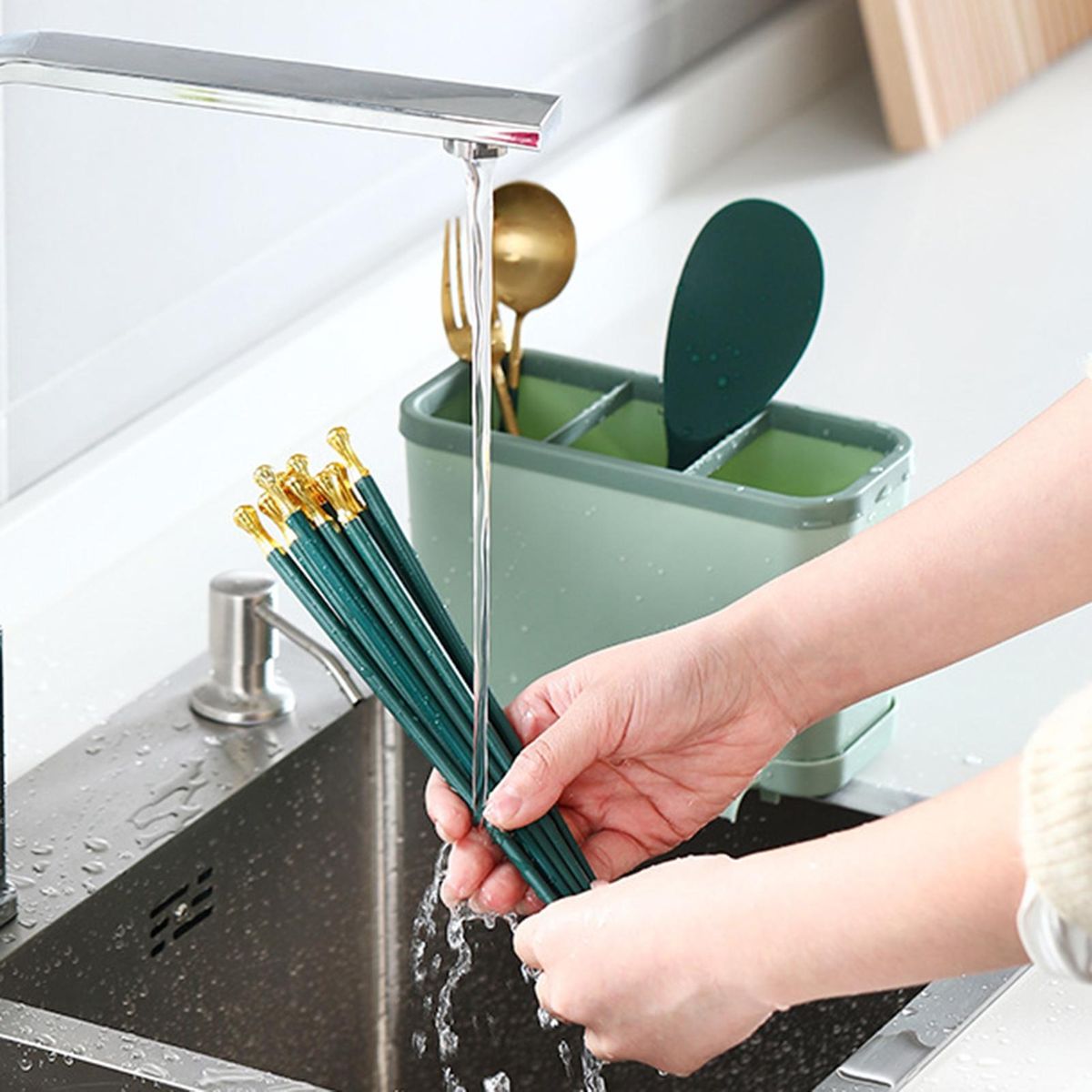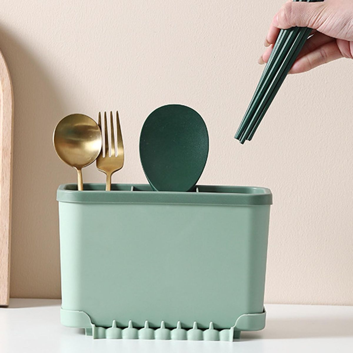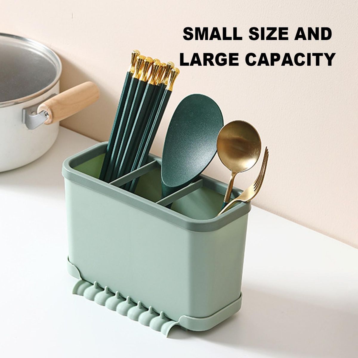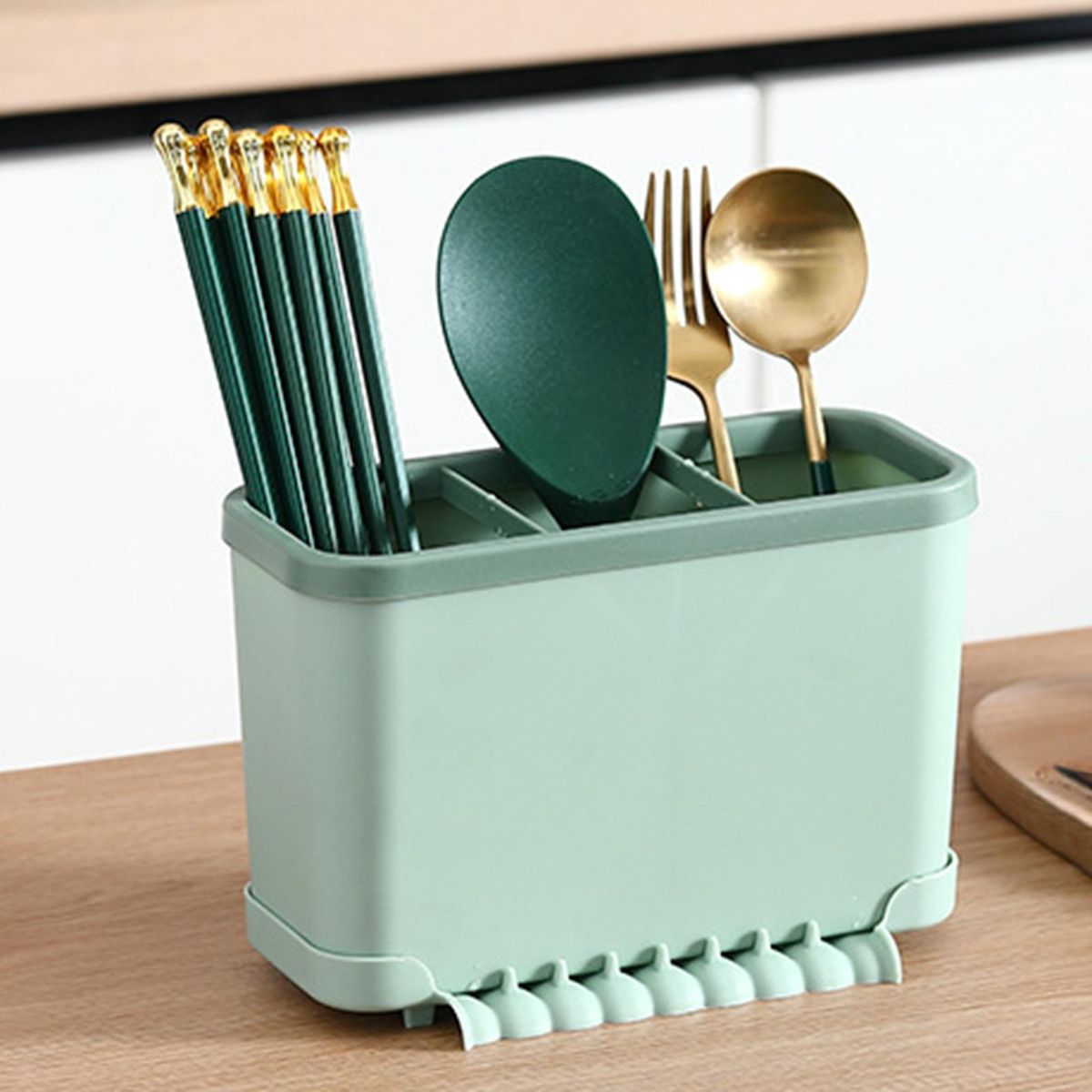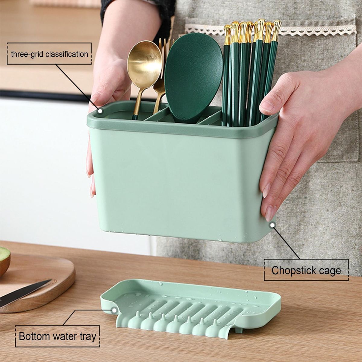 It is a chopstick holder with a large capacity, 3 grids and drainage holes, which can drain water quickly and store against moisture.