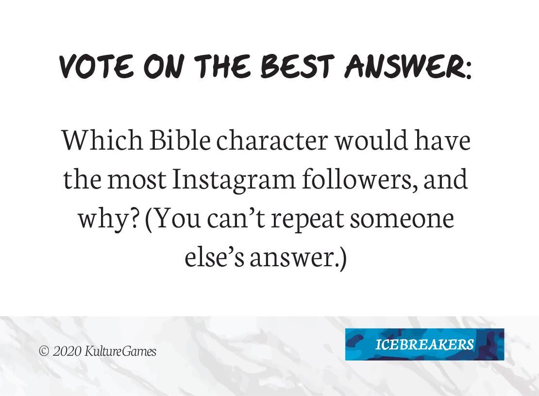 - Which Bible character would have the most Instagram followers, and why? (Icebreakers)
