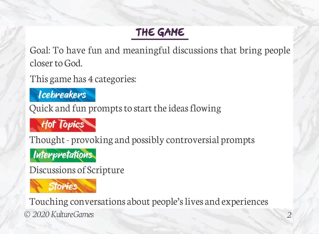 Icebreakers (Blue) - Quick and fun prompts to start the ideas flowingHot Topics (Red) - Thought-provoking and possibly controversial promptsInterpretations (Green) - Discussions of Scripture Stories (Yellow) - Touching conversations about people's lives and experiences