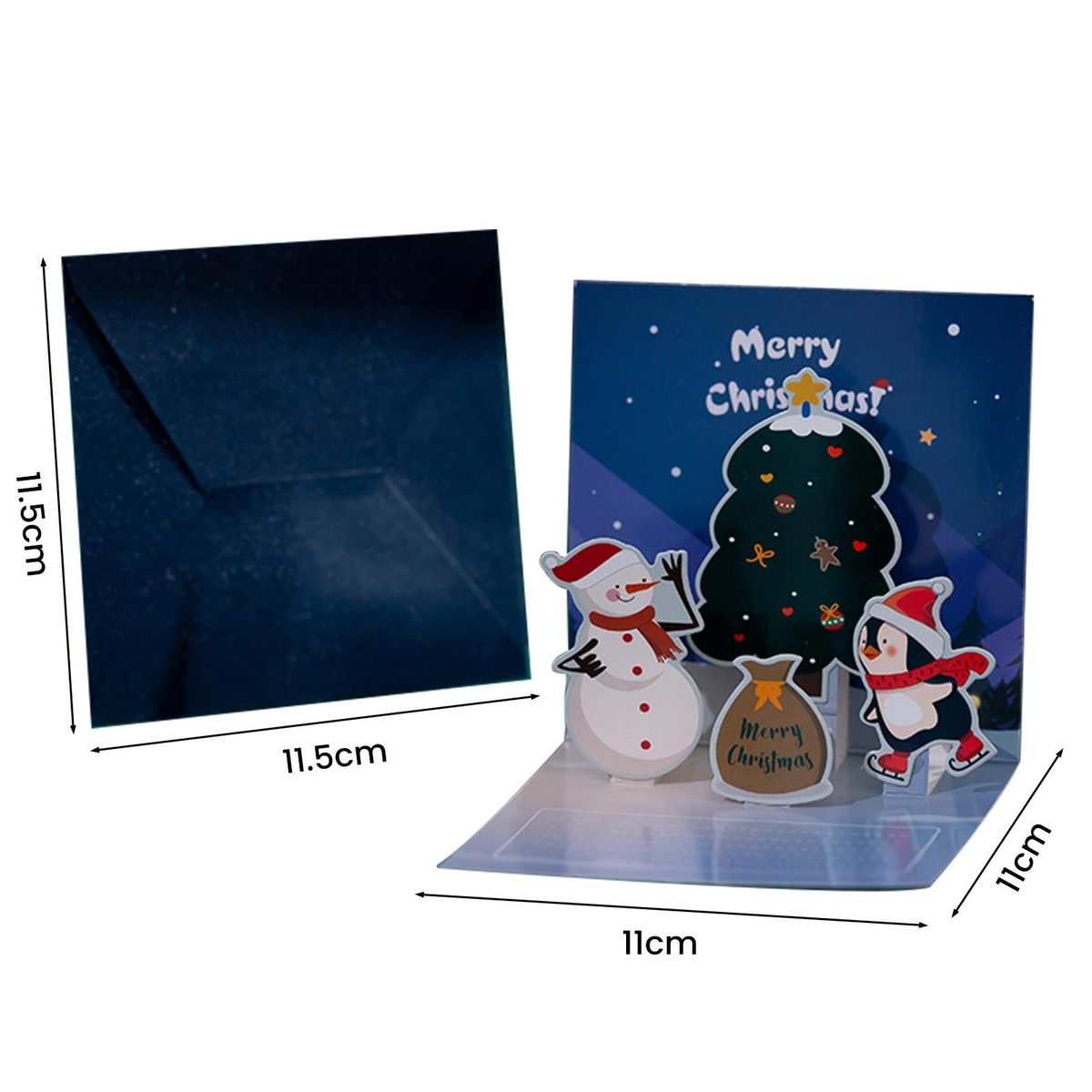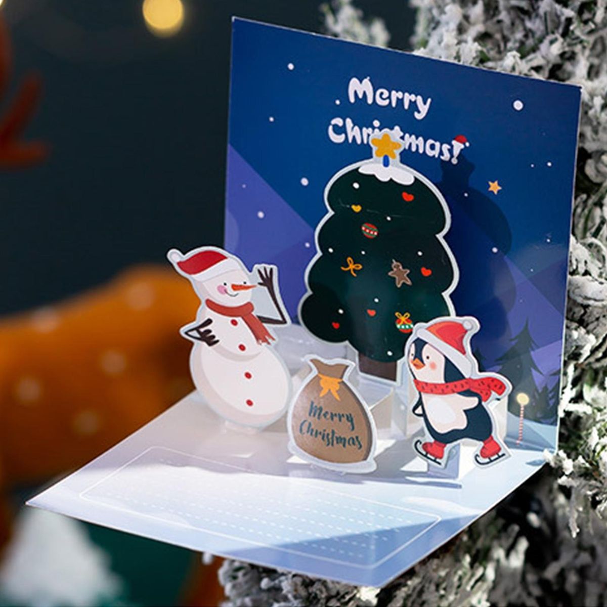 Featuring an adorable cartoon, three-dimensional design showcasing santa claus, snowman, elk, and other festive shapes, this card is guaranteed to bring joy to anyone who receives it. the vibrant images and christmas-themed elements create a captivating festive atmosphere, while the bright colors and clear patterns make it visually appealing.