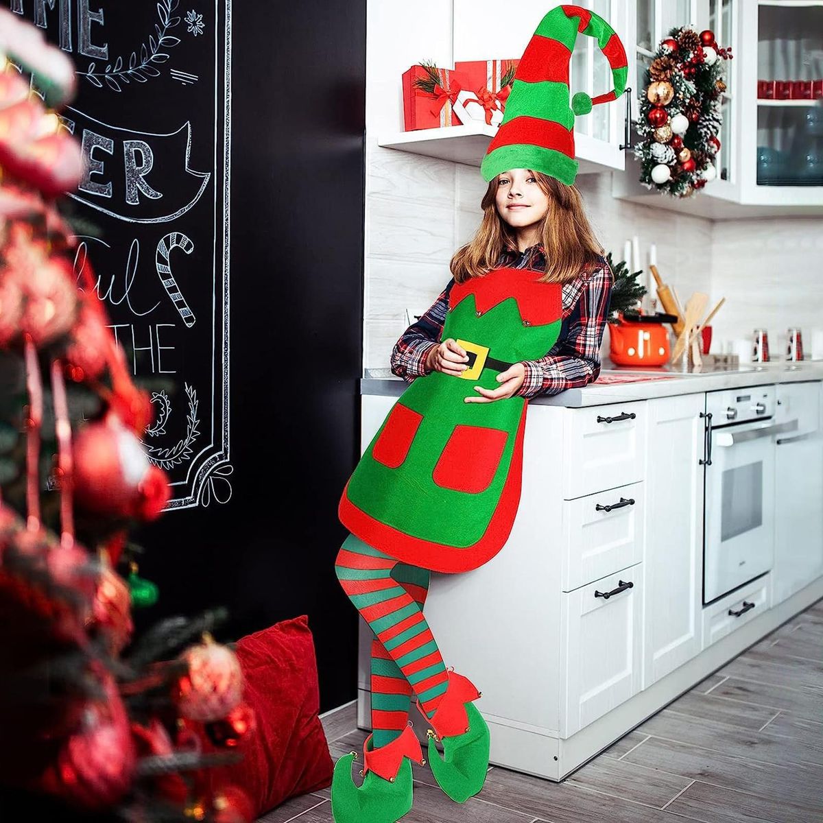 Our classic christmas themed designs feature adorable green elf patterns that will instantly dress up the festive atmosphere. each set includes a christmas apron and hat, along with options for elf ears or shoe covers and socks, allowing you to choose different styles of combination sets.