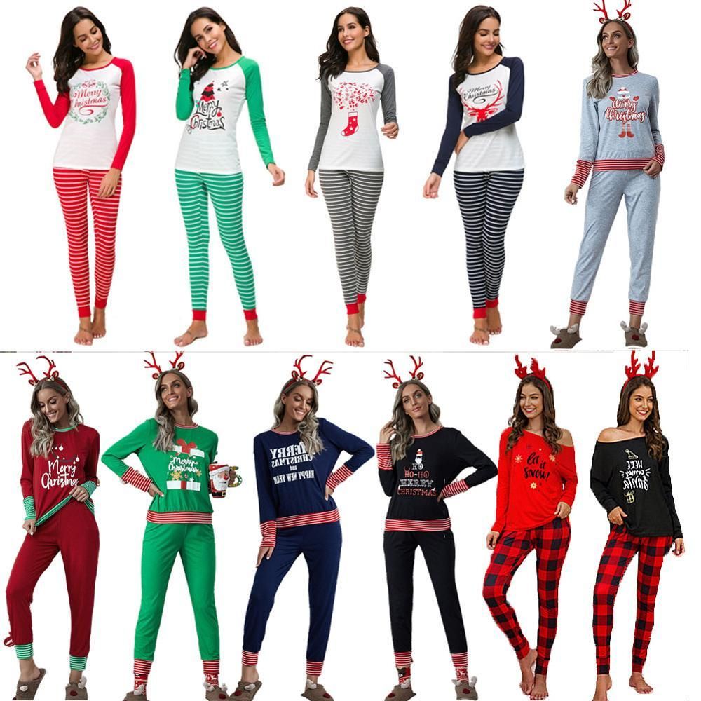 Traje de Navidad con letras impresas, camisa de manga larga, pantalones largos a cuadros, pijama informal para mujer, traje de servicio para el hogar, conjunto de dos piezas