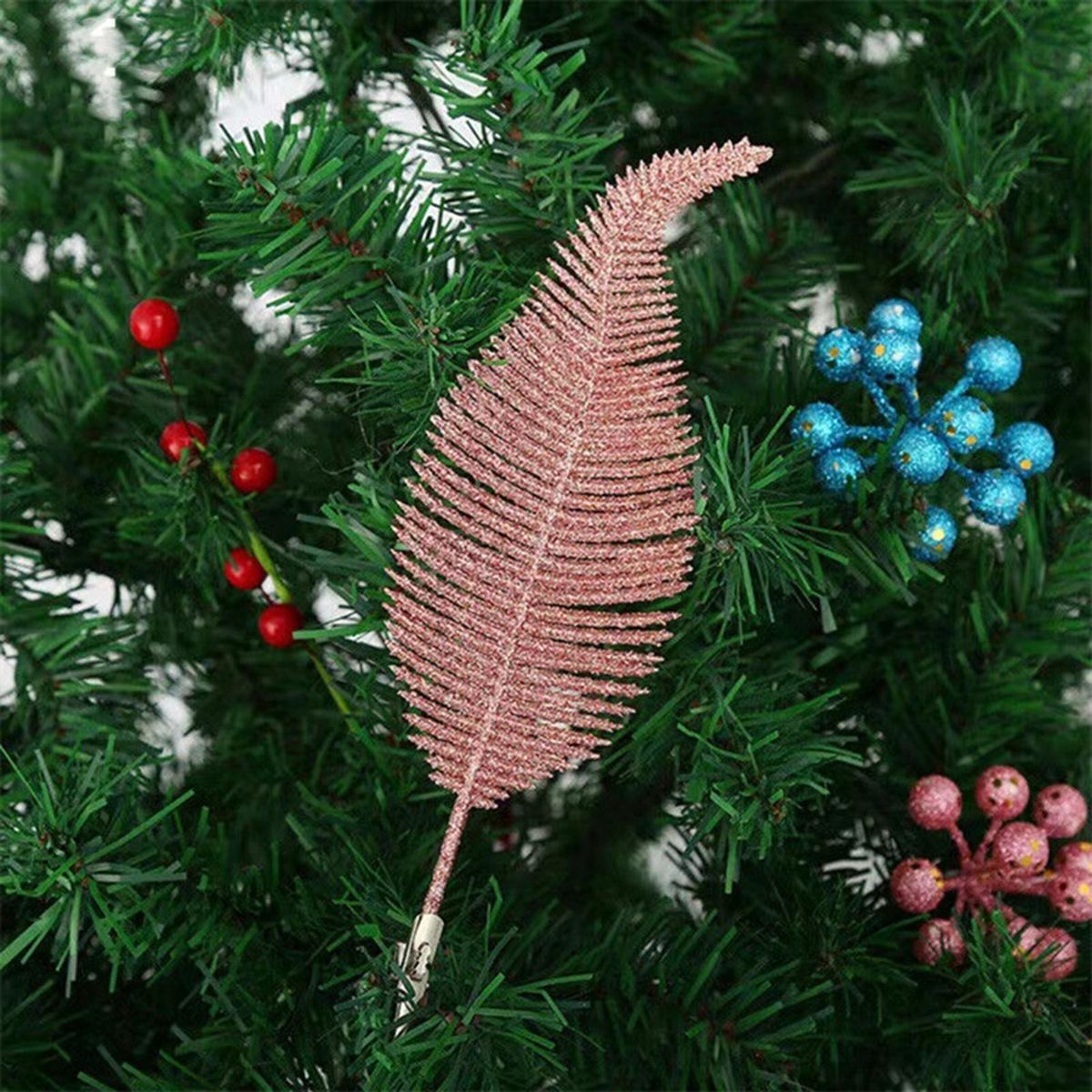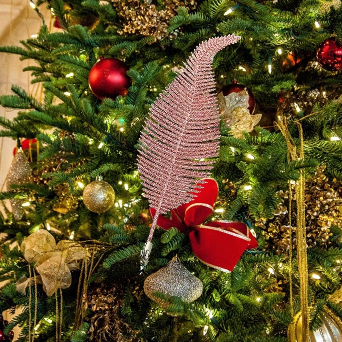 Our exquisite christmas tree pendant! this stunning ornament is the perfect addition to your holiday decor. it features bold and highly detailed simulation feathers, enhanced by golden powder for an incredibly lifelike appearance. the clip design allows for secure attachment to your christmas tree, making it a beautiful decoration that will impress all your guests.