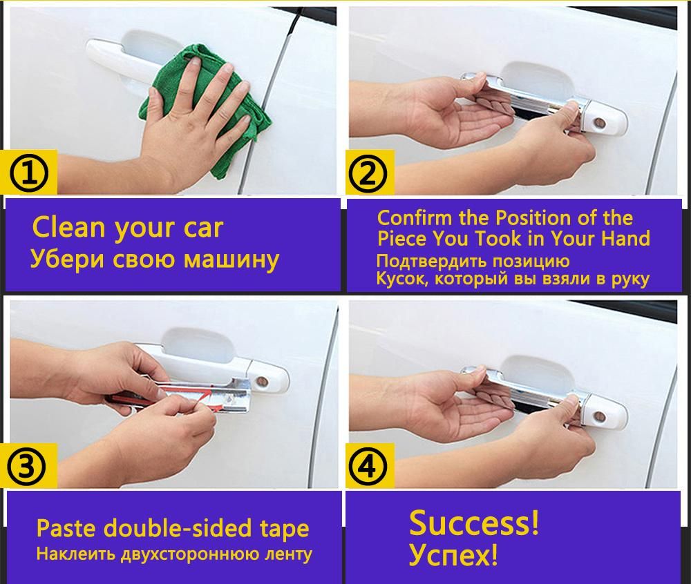 High quty stylish chrome door handle cover for outstanding car door handle protection. And highlight the exterior of the car. Made of High Quty ABS Chrome Plastic.They molded the contours of the handles outside the car to achieve a custom fit.Chrome door handle cover ensure maximum door handle scratching.At the same time enhance the external appearance of the car.Installation instructions:1. Clean your car2. Confirm the position of the piece you look inyour hand3. Paste double-sided tape4. Succe!!! Beautiful door handles are presented