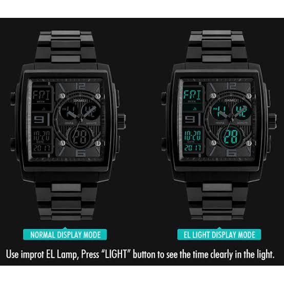 Dual time & date & chronograph & alarm & back light with durable stainless steel back and black resin strap. This watch comes with Precise quartz, analog & digital movement for accurate time keeping. It can go the depth of 50M in water, however do not press any buttons under water. Color may not appear as exactly as in real life due to variations between the computer monitors and naked eye Color difference.
