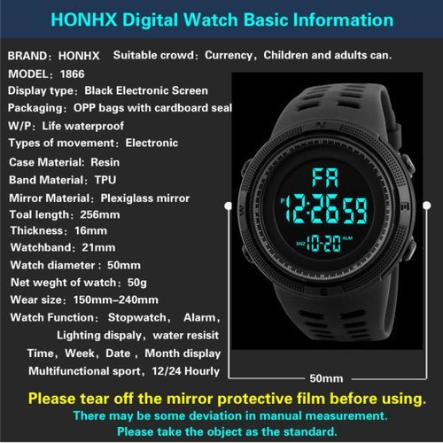 Dual time & date & chronograph & alarm & back light with durable stainless steel back and black resin strap. This watch comes with Precise quartz, analog & digital movement for accurate time keeping. It can go the depth of 50M in water, however do not press any buttons under water. Color may not appear as exactly as in real life due to variations between the computer monitors and naked eye Color difference.