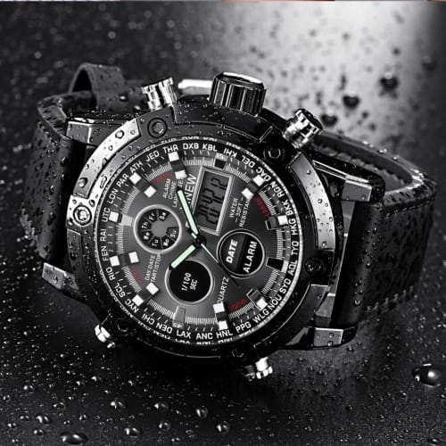 Style Watch: Large sporty Stainle steel dial with High quality Pu Leather sp, fits both outdoor and indoor activities, such as running, hiking and so on* Water resistant to 30M, meet your daily waterproof need(Note: don't pre any ons underwater, AVOID hot water or diving)* Perfect Gift for Men: Powered by Japanese on cells CR2025, provide precise time keeping and longer service life* Multi-function Watch: Dual time display, Auto Date, Week, Alarm, LED display, Shock Resistant, Stop Watch, Back Light* Clearance LED dial mixing ditional og dual time zones display lets you know the time more accurately no matter where you are.Special design with the chronograph (stopwatch) at 0.01 second increment