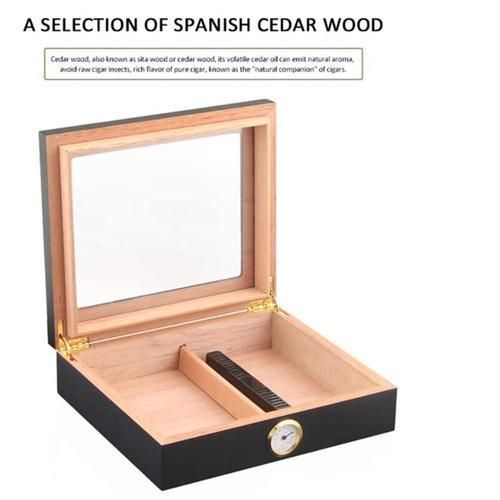 The cigar box is hand-made from Spanish cedar wood, with glass on the top, and the gold-plated hinges have good sealing properties to ensure that the cigars are kept fresh