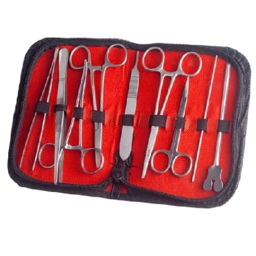 Well packed instruments for animal / cadaveric dissection. For use by medical/ paramedical students and practitioners both for learning and performing minor medical procedure. Can withstand the heat of sterilization and chemical sterilization tolerant