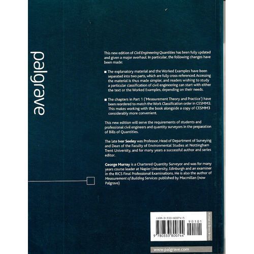 Synopsis: In this revised edition, the explanatory material and the worked examples have been separated into two sections. This change makes accessing of material simpler with all chapters being cross referenced to the appropriate worked examples, and all worked examples cross referenced back to the appropriate chapter and other relevant worked examples. The chapters in Part 1 have been re-arranged to suit the "Work Classification" order of Section 8 of CESMM 3. Both these changes should make the book more user friendly.