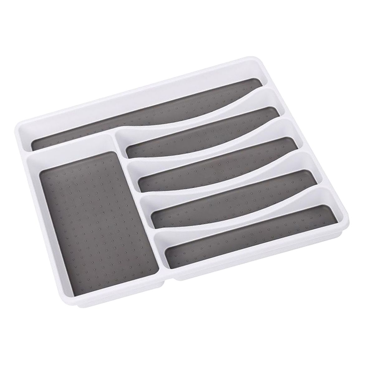 Rubber liner in each compartment keeps the cultery in place and non- rubber feet prevent the tray from sliding around in drawer.