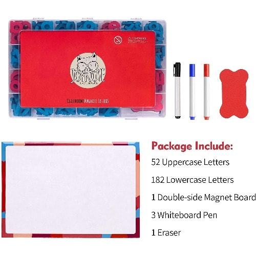 This Classroom Magnetic Letters Kit with Double-Sided Dry Erase Magnetic Board, Foam Alphabet Letters for Kids Spelling and Learning, can be used as fridge magnetic letter as well. Comes with sturdy storage box containing uppercase letters, lowercase letters, whiteboard pen, double-sided magnetic board, and eraser totalling 239 items.