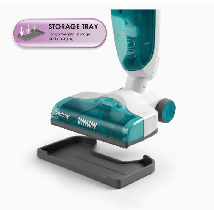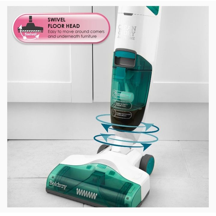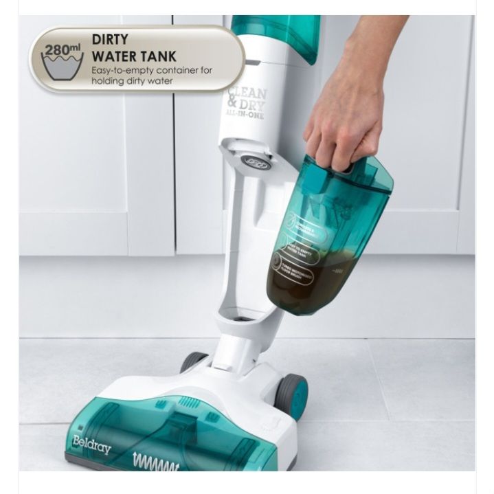 Wash, clean and remove water to leave all hard floors spotless and dry with the fantastic Beldray Clean & Dry Hard Floor Cleaner.The cordless unit has an easy-empty 280 ml dirty water tank, and an easy-fill 550 ml clean water tank for a fresher cleaning solution.Designed to avoid cleaning with dirty water, switch to the boost function for an extra clean blast against stubborn dirt and grime.The dual purpose brush bar simultaneously cleans and dries while the swivel floor head makes cleaning corners and under furniture easy.The 22.2 V rechargeable lithium-ion battery allows for up to 30 mins operating time for cleaning wood and hard floors with one charge.
