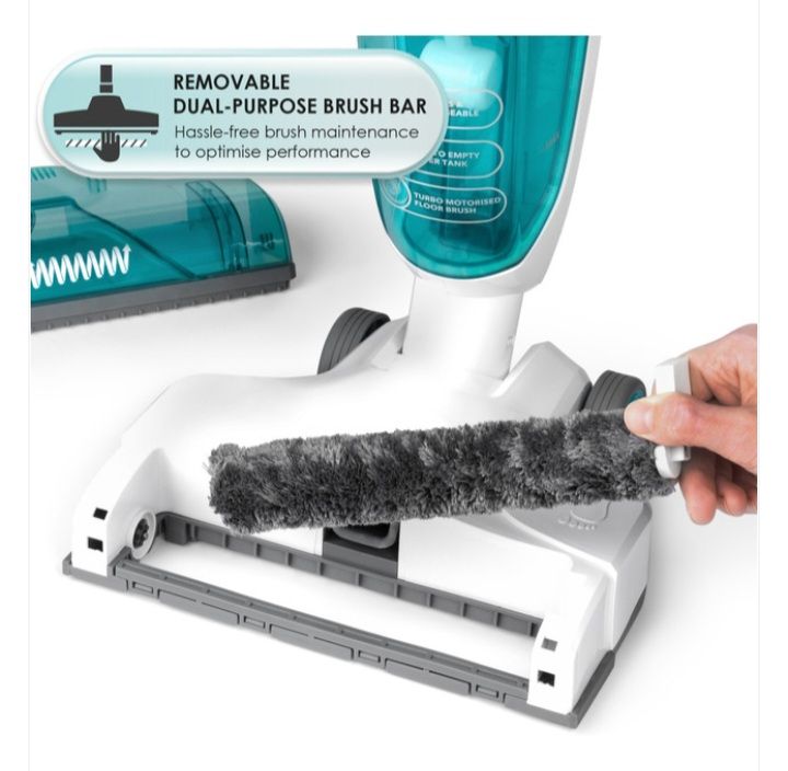 The dual purpose brush bar simultaneously cleans and dries while the swivel floor head makes cleaning corners and under furniture easy.