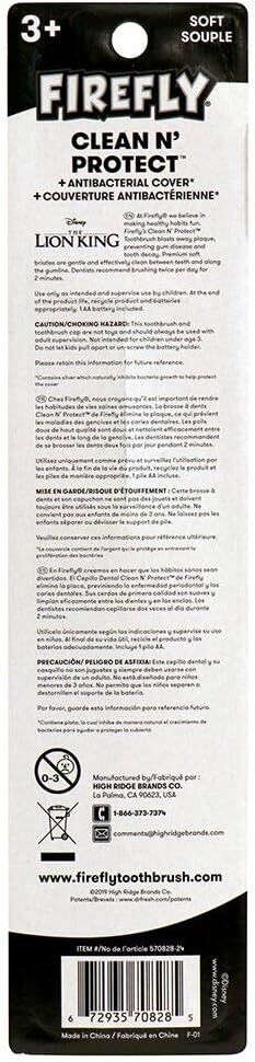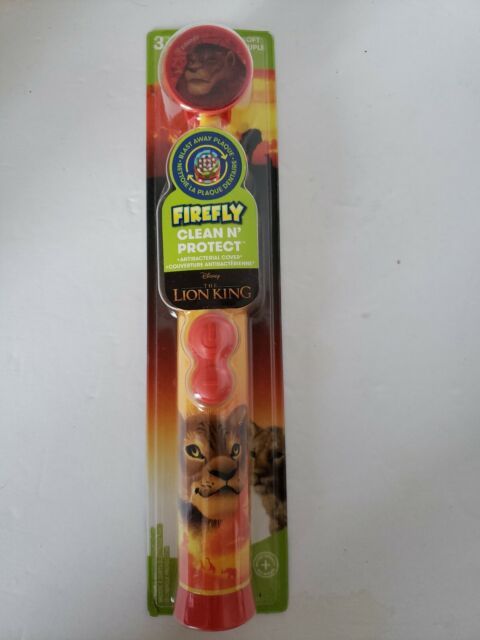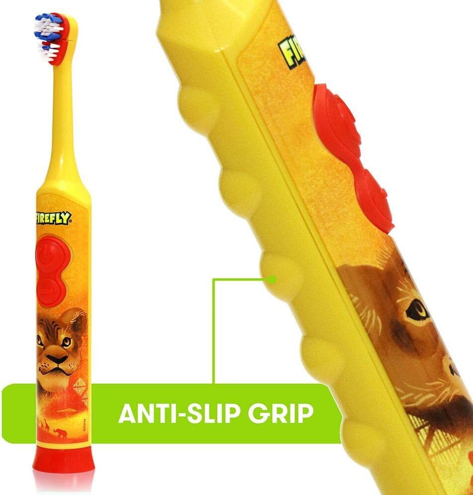 Brushing with the Firefly Clean N Protect toothbrush is enjoyable and effective. It has a rotating soft head that blasts plaque away, preventing gum disease and tooth decay. Its massaging action stimulates gums while cleaning teeth effectively. This brush has an ergonomic handle for a non-slip grip, as well as a compact head designed for children's mouths, as well as a fun antibacterial character cap to keep the toothbrush clean.Firefly Lion King Power Rotary Toothbrush